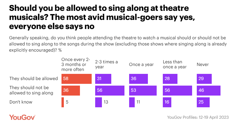 We can, I hope, all agree that violence or abuse of Front of House staff is never OK, but a YouGov poll released today shows that there is little cohesion in audience attitude elsewhere. Of those who attend the most musicals (once every 2-3 months), 58% say they should be able to sing along.